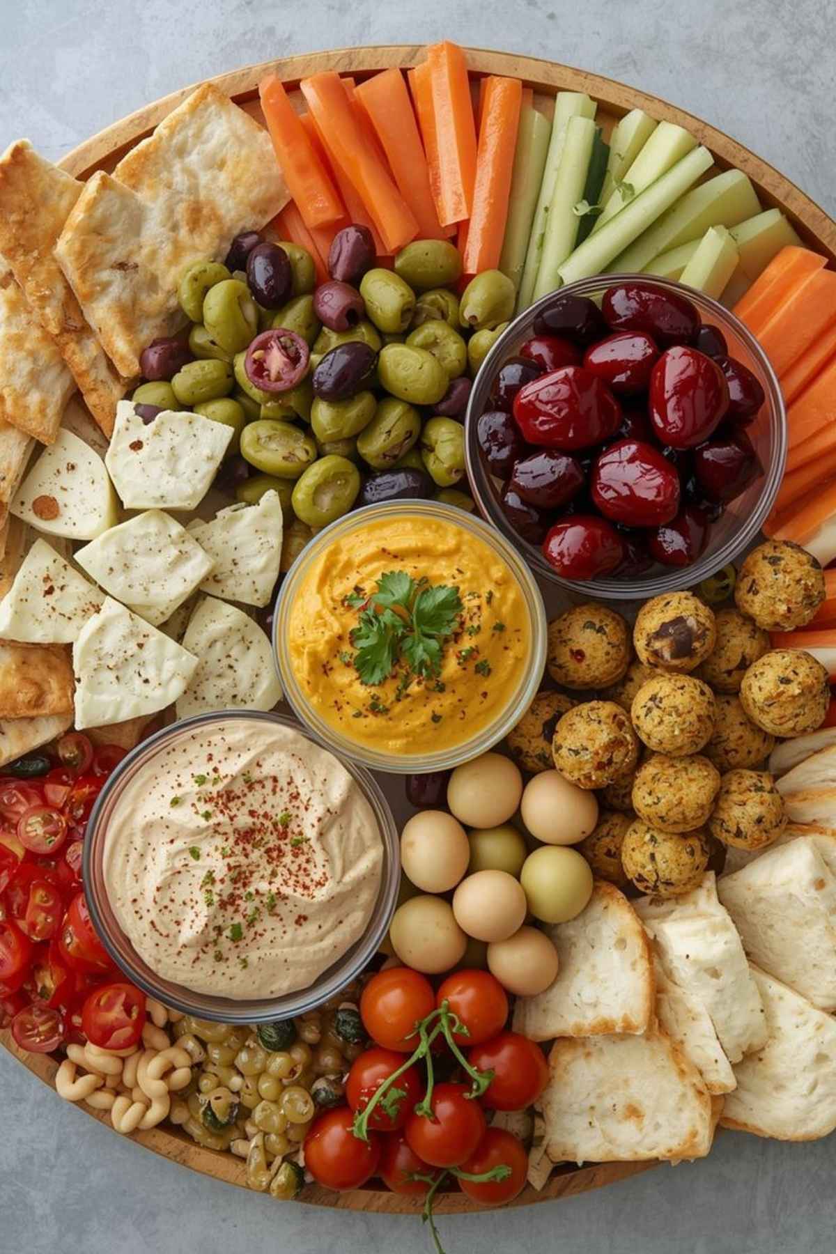 Include classics like hummus, tzatziki, olives, falafel, pita bread, and an array of fresh vegetables. Garnish with fresh herbs and a drizzle of olive oil for an enticing and shareable appetizer.
