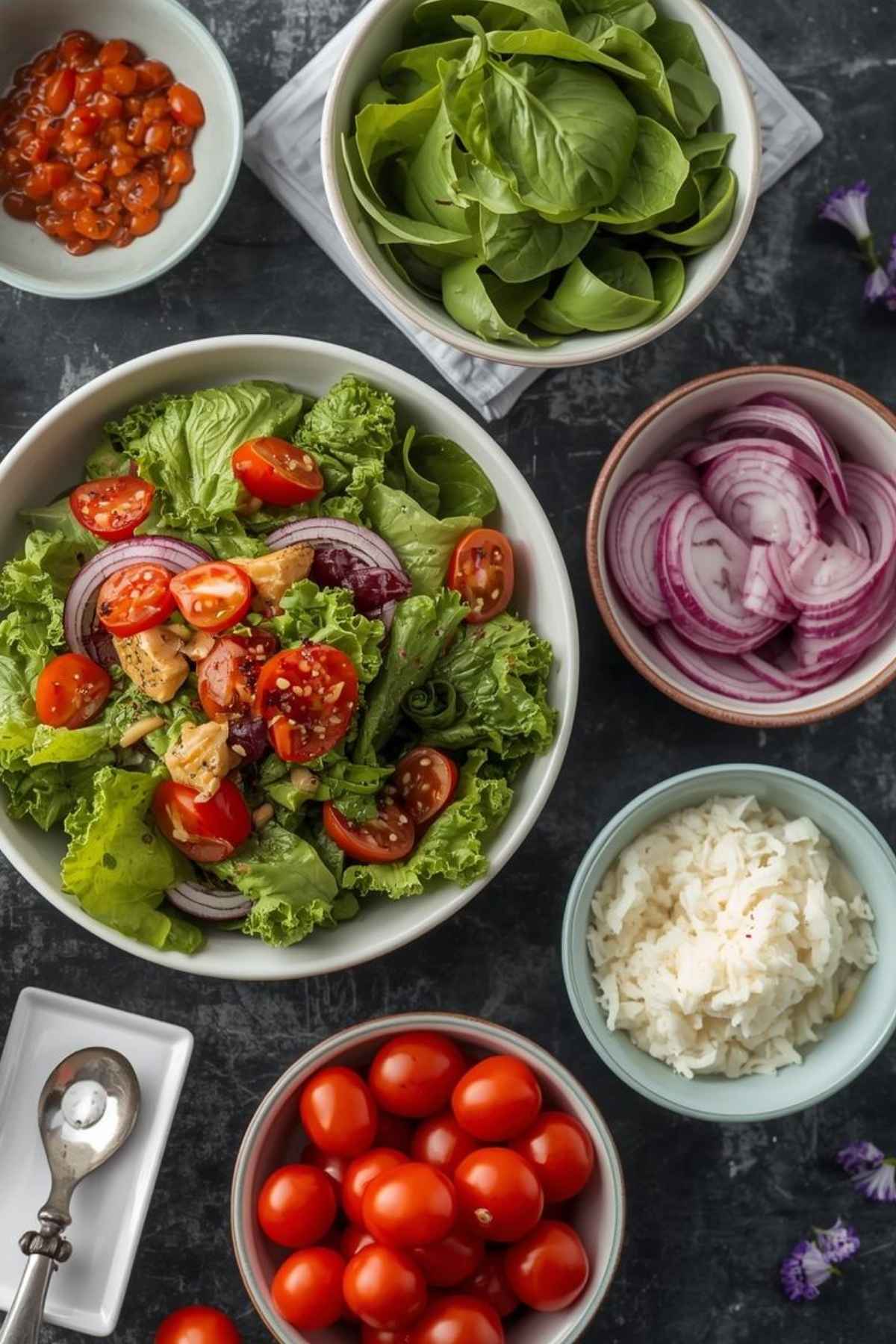 Offer a few cheese options like feta, goat cheese, parmesan, or shredded mozzarella. The variety adds richness and flavor to each salad.