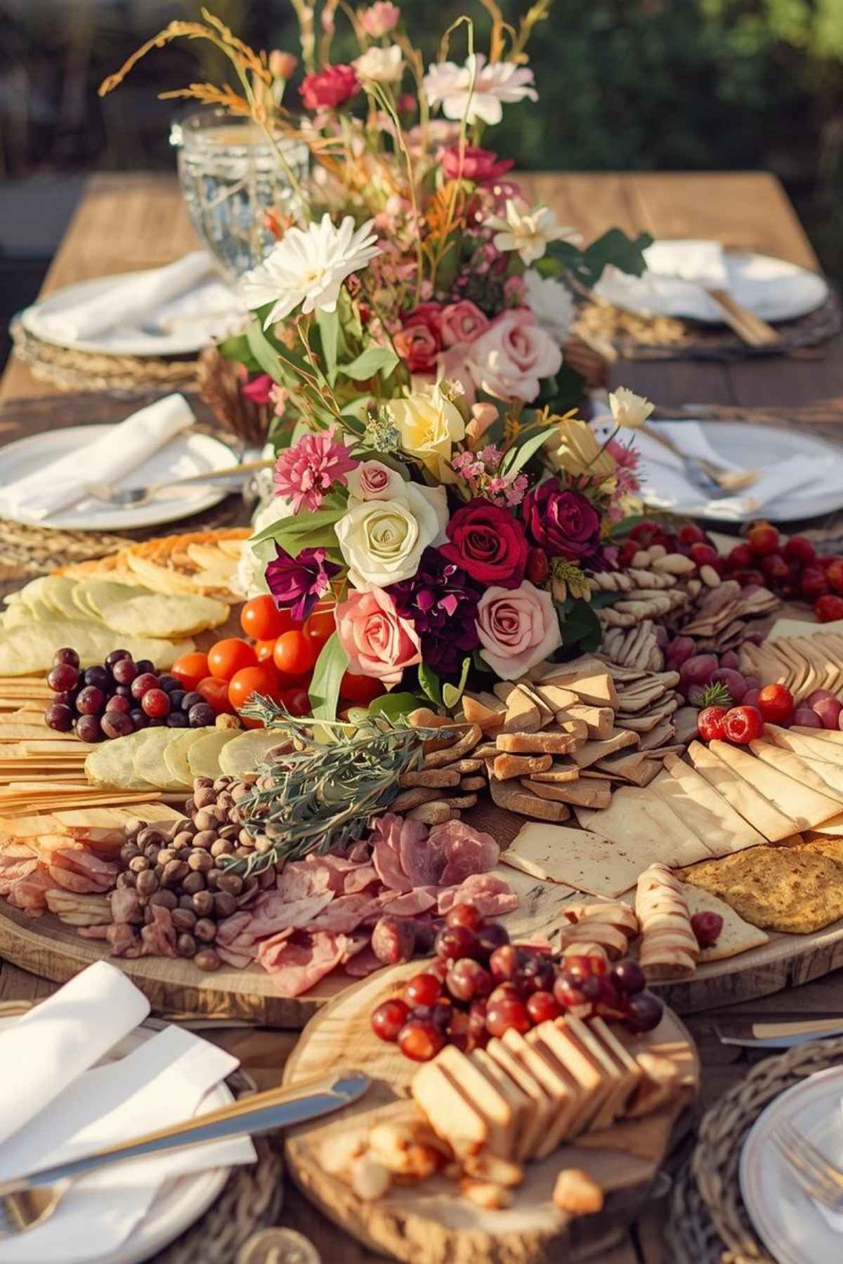 Fill the table with an array of artisanal cheeses, cured meats, fresh fruits, olives, nuts, and a variety of bread and crackers.